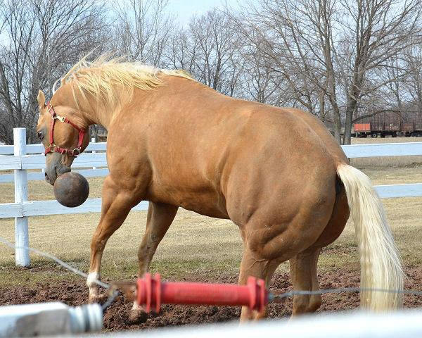 A little excitement today. We didn't have to collect and ship so Leah Gloudemans turned Fred (Classically) n the arena for some exercise. It is so cold and windy here, we decided not to put him outside. Leah came in the office and told me she thought he was cast as she heard all this banging and when she went to the arena, there was Fred. We have a cowhide on the breeding dummy and he had reached over the gates and was throwing it around. I don't know if he thought he should be collecting today or that he is really a "cowpony" The arena was filled with dust and he had a great time and got plenty of exercise. Leah took it away from him and gave him the "big ball" to play with. Well, he proceeded to smash it. It is too bad because little Trigger enjoyed playing with that ball and he was not as rough on it as Fred was. I guess I will have to find another toy for Trigger. |