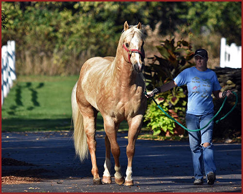 Finally a good day to get Fred (Classically) out in the sun. After his "collection" Leah Gloudemans, who is our stallion manager, gave him a bath and then put him out in a grassy pen to eat. He is such a pretty golden color this spring. |
