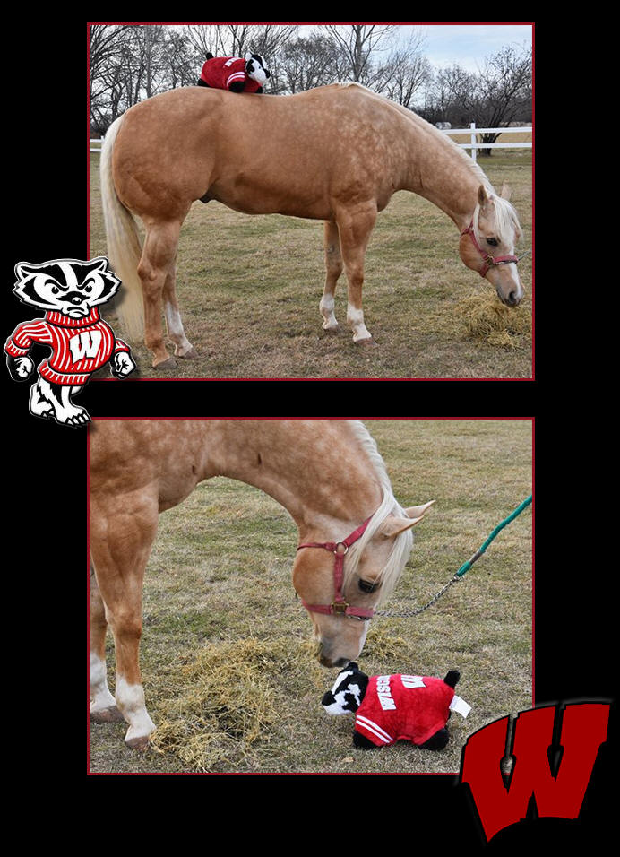 Well, today is the Big Ten Championship Football game and the Wisconsin Badgers will be playing the Ohio Buckeyes. Wisconsin is currently ranked #4 and Ohio State #8. However the sports announcers and "people in the know" say that Wisconsin is going to get beat because we have had an easy schedule and are not a good team. Well, last night there was a "little pow-wow" in our back pasture between Fred (Classically) and Bucky Badger. Evidently they were discussing game strategy and I think they have it figured out. We shall see tonight. Fred even let Bucky ride on his back while showing him some special maneuvers. They were both pretty exhausted after the ordeal and Fred was ready for a little hay. |
