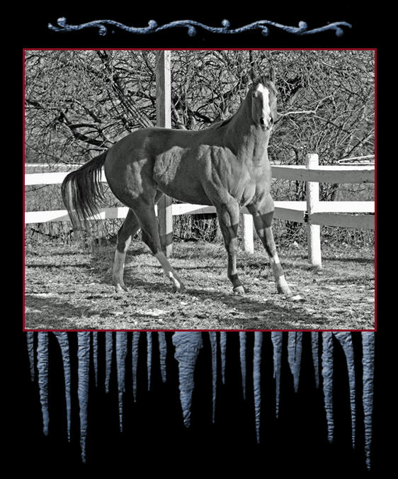 Sudden change in weather in Wisconsin. Very windy and cold with a wind chill below 0. Horses were inside for 2 days because I didn't want to get deep hoof prints in the mud. They were a bit lively today and it is icy. In keeping with the black and white photos, I snapped a picture of Wilma (Classically Kool) She is now 4 years old and is NN. Sired by Fred (Classically) out of Rebecca (You Bet Im Cool) I had always heard that when you inbreed horses (Rebecca and Fred are half brother-sister) the resulting foal is small. Well, that is not the case with Wilma as she now measures 16.3 at the withers and even taller at that hip. |