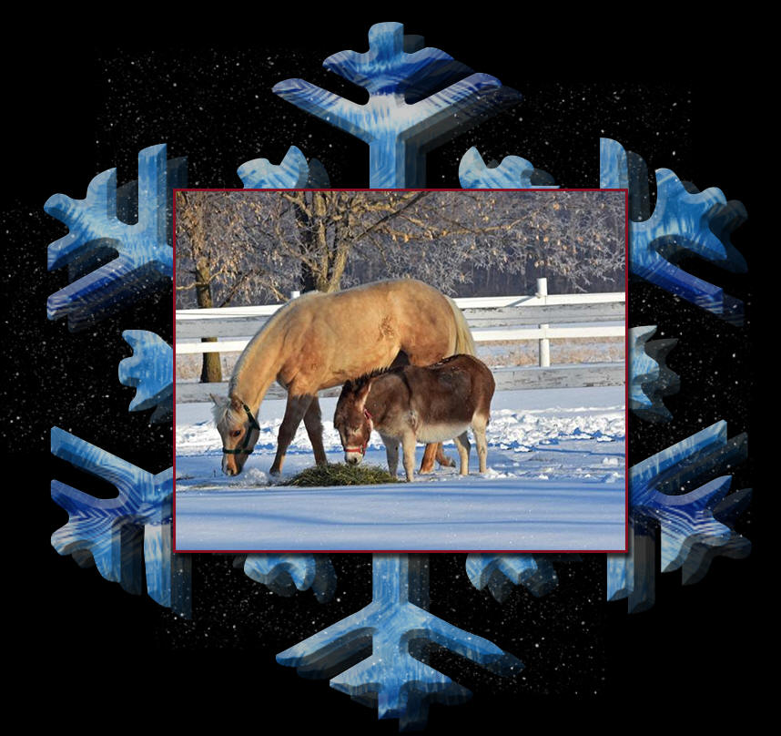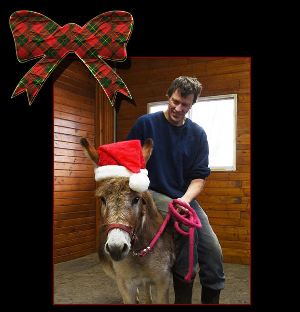 Many, many years ago when I was a little girl, I finally got my Christmas wish, a Shetland pony named Ginger. Well, in this day and age, I also have another little "angel" in my life. His name is Gabriel and he is a miniature donkey. Jaleen Hacklander let us borrow him when we needed a companion to keep our orphan colt company. Of course, we fell in love with him and had to own him. When CharlieO, the orphan left for his new home, Gabe became the companion of Pebbles, our then weanling filly and they have been together every day when they go outside. Well, Gabriel has found a new job. A little over a month ago, Rebecca (You Bet Im Cool) came up lame and was not putting any weight on her rear leg. X-rays and ultrasound showed that she tore the meniscus in her stifle. Of course I was devastated and had to do everything in my power to save her. We all know that a horse cannot survive on three legs. I am so lucky to have my wonderful veterinarian and friend, Dr. Katherine Fox and also another excellent "leg vet", Dr. Sarah Peters taking care of her. After they were able to get the swelling down, Dr. Peters injected stem cells into her stifle. That and laser therapy have been her treatment along with pain medications. Well, Rebecca has to be confined to her stall for 2 months. Rebecca is one of those horses that "needs" a buddy and her buddy had been Wilma. Well, Wilma is a young mare and it is not conducive to keep her locked in a stall. So, what did we do? Little Gabriel to the rescue. We divided a stall with panels and Rebecca lives on one side and Gabe on the other. You would not believe how attached she is to him. I honestly think she thinks he is her baby. She has a fit when we move her across the aisle in order to clean her stall until the donkey is tied to the front of the stall. There is another wonderful "angel" in this picture and that is Vicki Livasy. She has the same machine that the vets were using on Rebecca and she sent it up here for us to use. There are not many friends who would do that and I will be forever grateful to her. I will keep you updated as to how things are going and hopefully Rebecca will recover and I will be able to get that "illusive embryo" next year. Merry Christmas from me and all the critters at Ellis Quarter Horses. Leah Gloudemans took this picture of Gabriel sporting his Santa hat and Bob Luebker who I couldn't continue to raise horses without his help. |